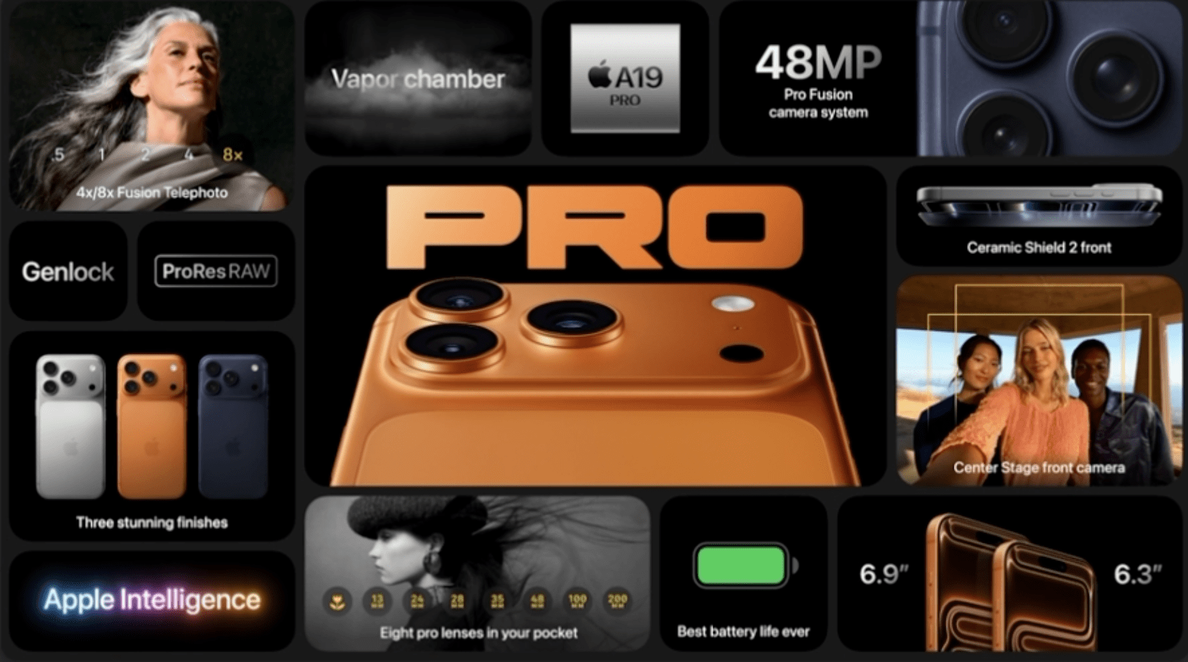 Pro modeli koriste A19 Pro čip 3-nm za vrhunsku brzinu i efikasnost Ravnoteža aluminij staklo struktura dizajna Horizontalna kamera traka preko zadnje strane za dramatičniji izgled Pro Max model dobija najveću bateriju do sada 5088 mAh sa parom modela idealan za dugotrajnu upotrebu Osvjetljen zaslon sa većim peak brightnessom poboljšano hladjenje pomoću vapor chamber sistema Rezolucija kamere do 48MP ultrawide telephoto periskop opcije i 8× optički zoom 8K video snimanje 24MP selfie kamera 12 GB RAM-a i minimalno 256 GB po cijeni od oko 1199 USD